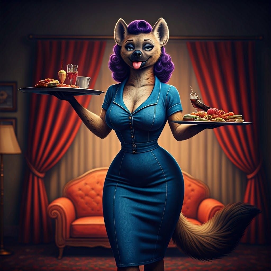 This image shows a stunning, anthropomorphic she-hyena in a nostalgic 1950s setting, balancing a tray of hors d'oeuvres in a fitted, blue denim dress. Her dark hair is styled in luscious curls, and her smoky eyes exude flirtatious charm, blending whimsy and cinematic flair.