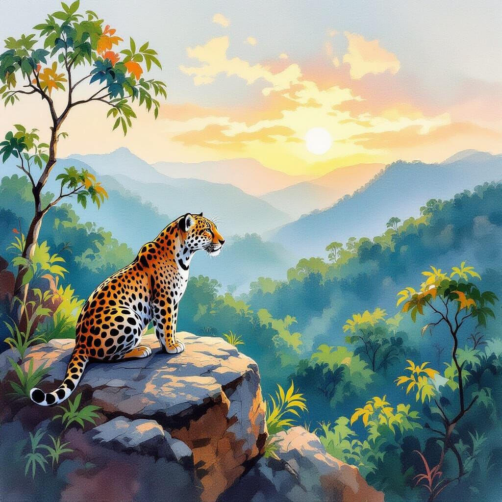This image shows a lone jaguar on a rocky outcrop, overlooking the Amazon rainforest bathed in soft morning light. Rendered in a watercolor style with expressive brushstrokes and flowing gradients, it evokes a poetic atmosphere.