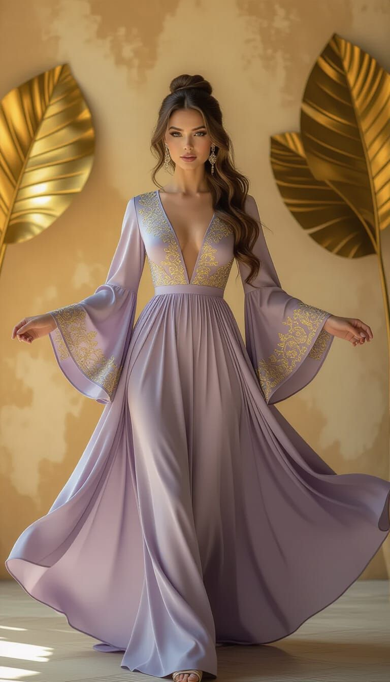 This image shows a beautiful woman in a violet silk gown with golden embroidery, posing against a golden wall. The photo-realistic image is enhanced with cinematic lighting, film grain and a warm, golden glow.