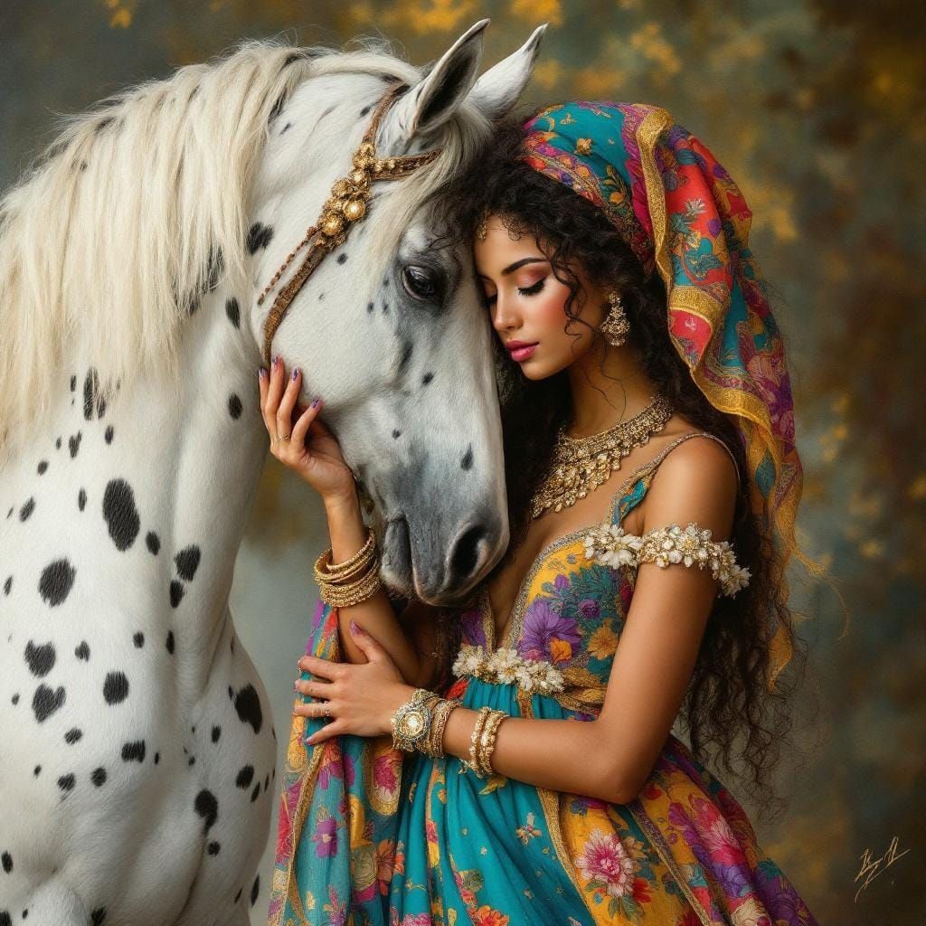 A striking picture of a young woman in a colorful dress with jewelry and a scarf, standing with a white spotted horse. The image is an ornate and realistic oil painting.