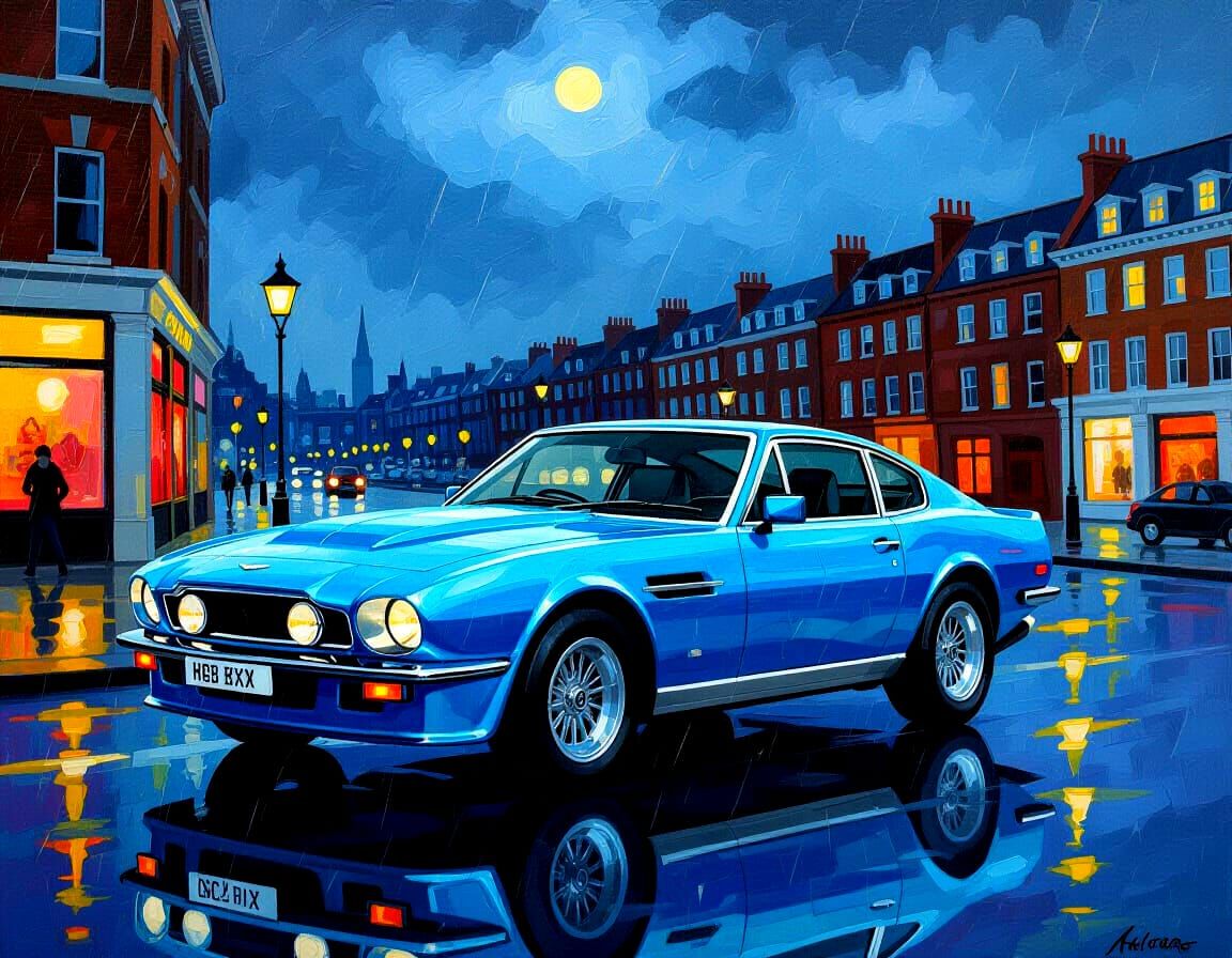 This image shows a 1982 Aston Martin V8 Vantage in a pearlescent blue, parked on a rainy London street. Rendered as an impasto acrylic painting with bold textures.