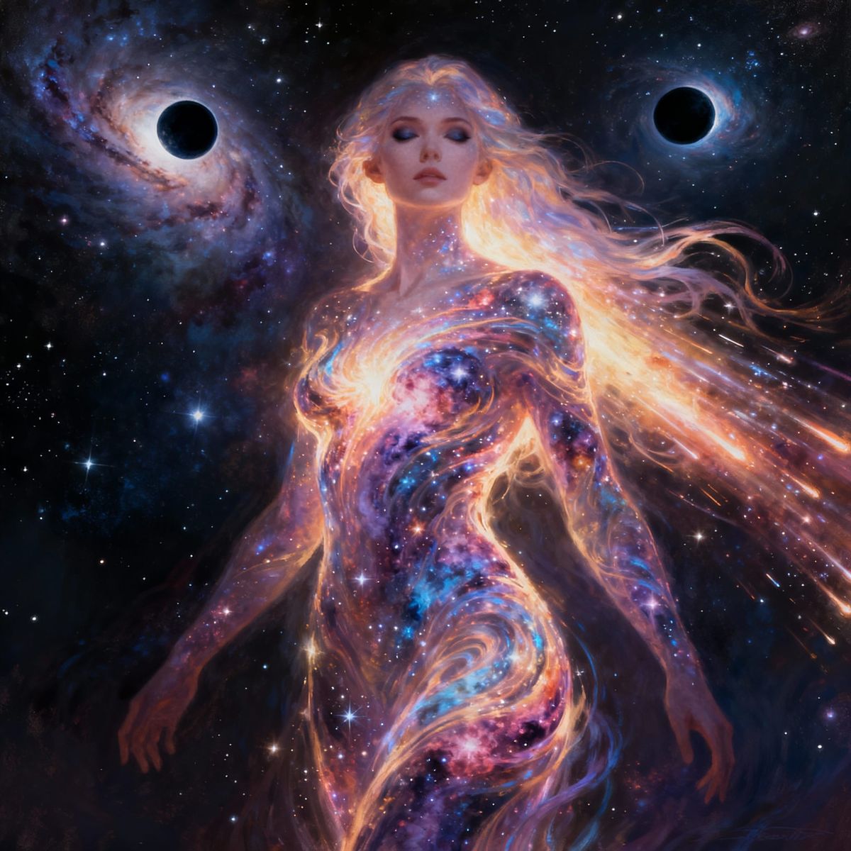 This image depicts a cosmic woman formed from luminous stardust and nebulae, with eyes like black holes and hair like a comet's tail, presented in a hyperrealistic digital art style with vibrant colors.