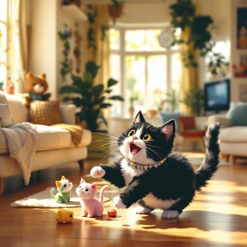 A cheerful black and white cat plays with toys in a sunlit room. The image captures a whimsical, dreamy aesthetic reminiscent of classic watercolor illustrations and playful animation.