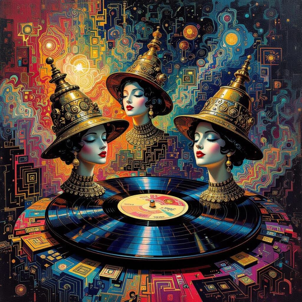 This abstract surrealist image features floating heads with bell hats on a vinyl record, surrounded by swirling alcohol ink and cubist patterns. Vibrant colors and dramatic lighting create a psychedelic, ornate scene.
