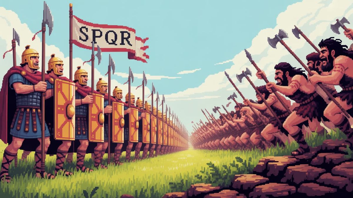 Retro 128-bit pixel art of a kind and cheerful Roman Legion facing off, across the grassy and rocky field of battle with a horde of ragged clothed warrior Picts carrying handmade weapons. The sky is unambiguous, bathed in the light of a clear, sunny day. The setting embodies the classic Play Station ...