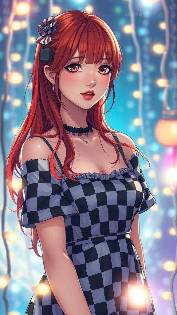 A digital anime-style portrait of a woman with long red hair and hazel eyes wearing a checkered dress. The surreal image features fantastical elements and delicate string lights.