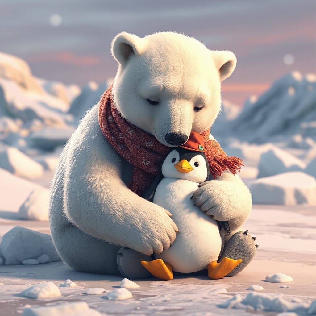 This image features a polar bear gently holding a penguin in a peaceful snowy setting. The art style blends 3D anime with detailed textures and soft lighting for a captivating scene.