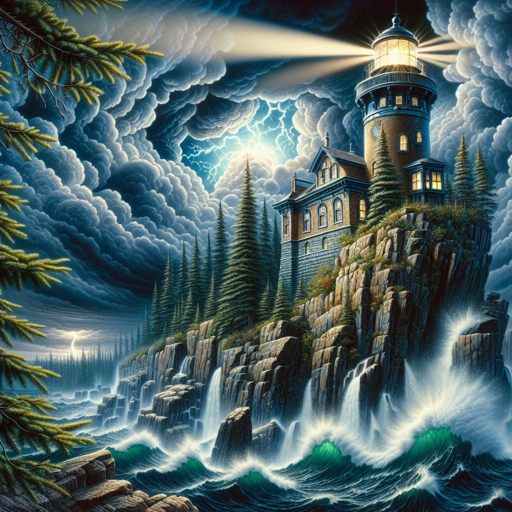 A striking picture of a lighthouse battling a fierce storm. Towering waves crash against the rocky outcrop as lightning illuminates the sky. The image, in a maximalist style, uses a rich color palette to convey mystery and awe.