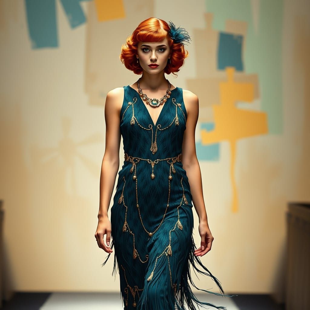 This image showcases a stunning Art Deco flapper dress in peacock hues, adorned with gold accents, feathers, and beaded fringe. A young woman in her 20's confidently struts down a runway, her vibrant red hair and makeup adding to the glamour of the scene.