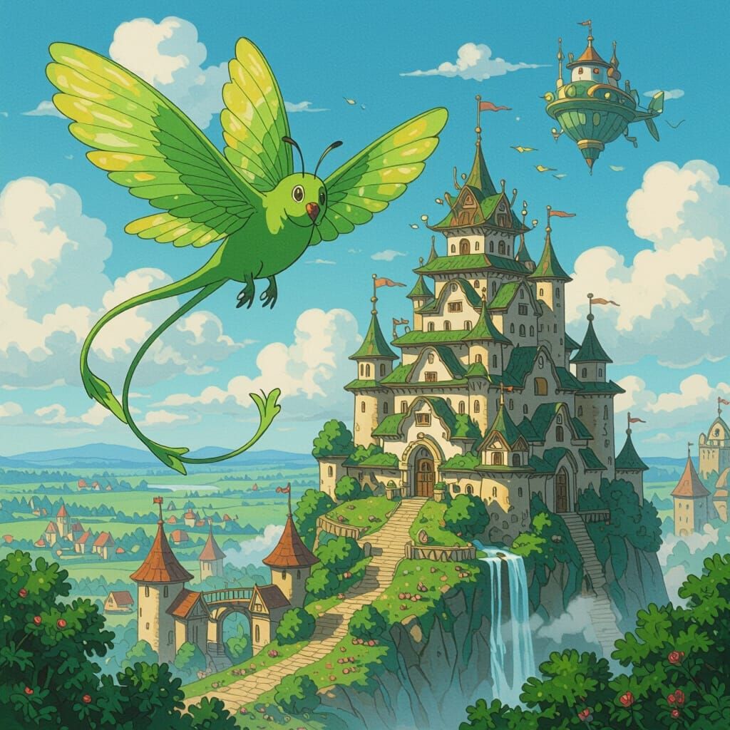 A green flying creature with delicate wings stands near a Laputa-inspired city overgrown with plants and flowers, rendered in a vibrant fantasy art style.