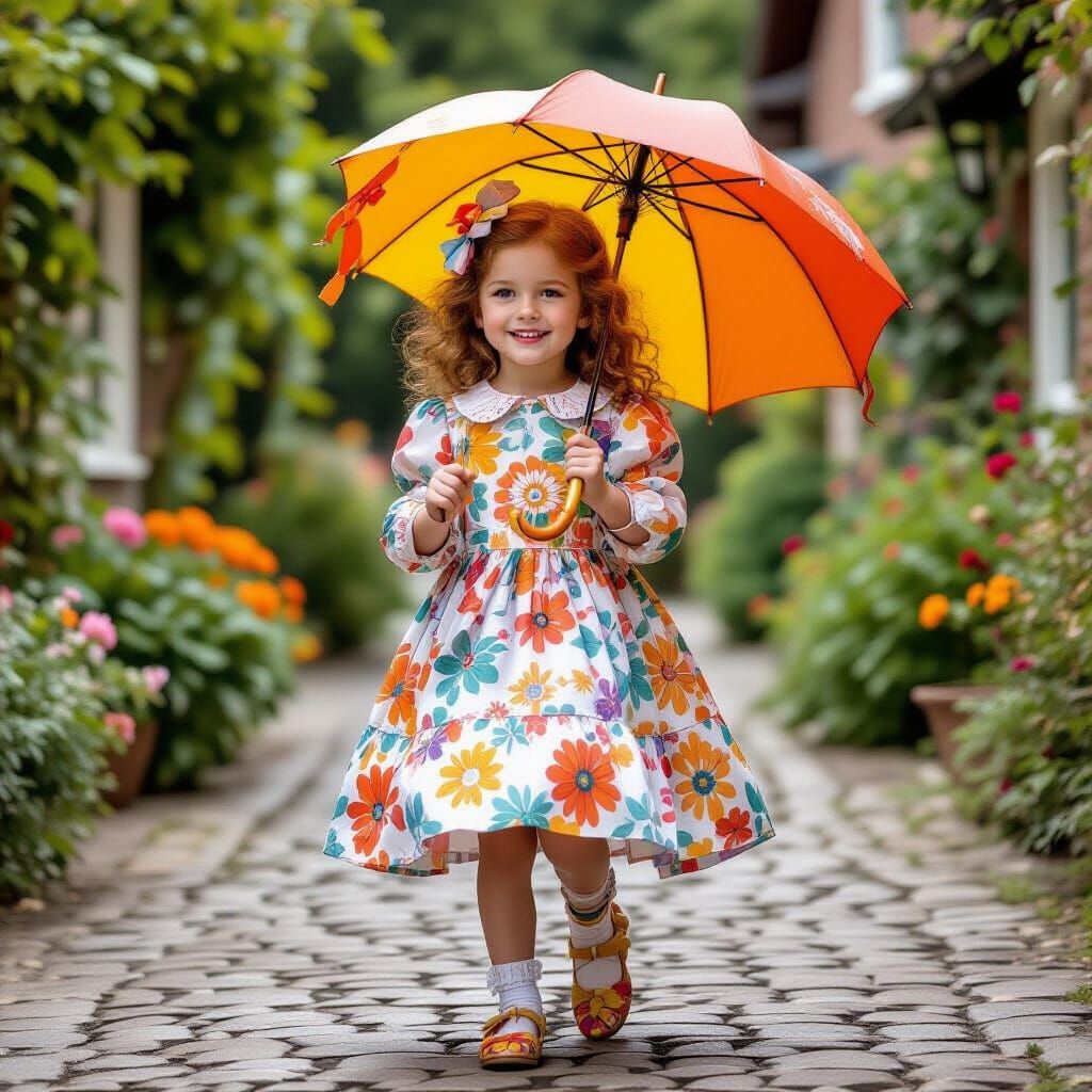 This image shows a whimsical girl with curly brown hair in a vibrant patterned dress. She holds a colorful umbrella and her shoes are adorned with ruffles, in an illustrative style.