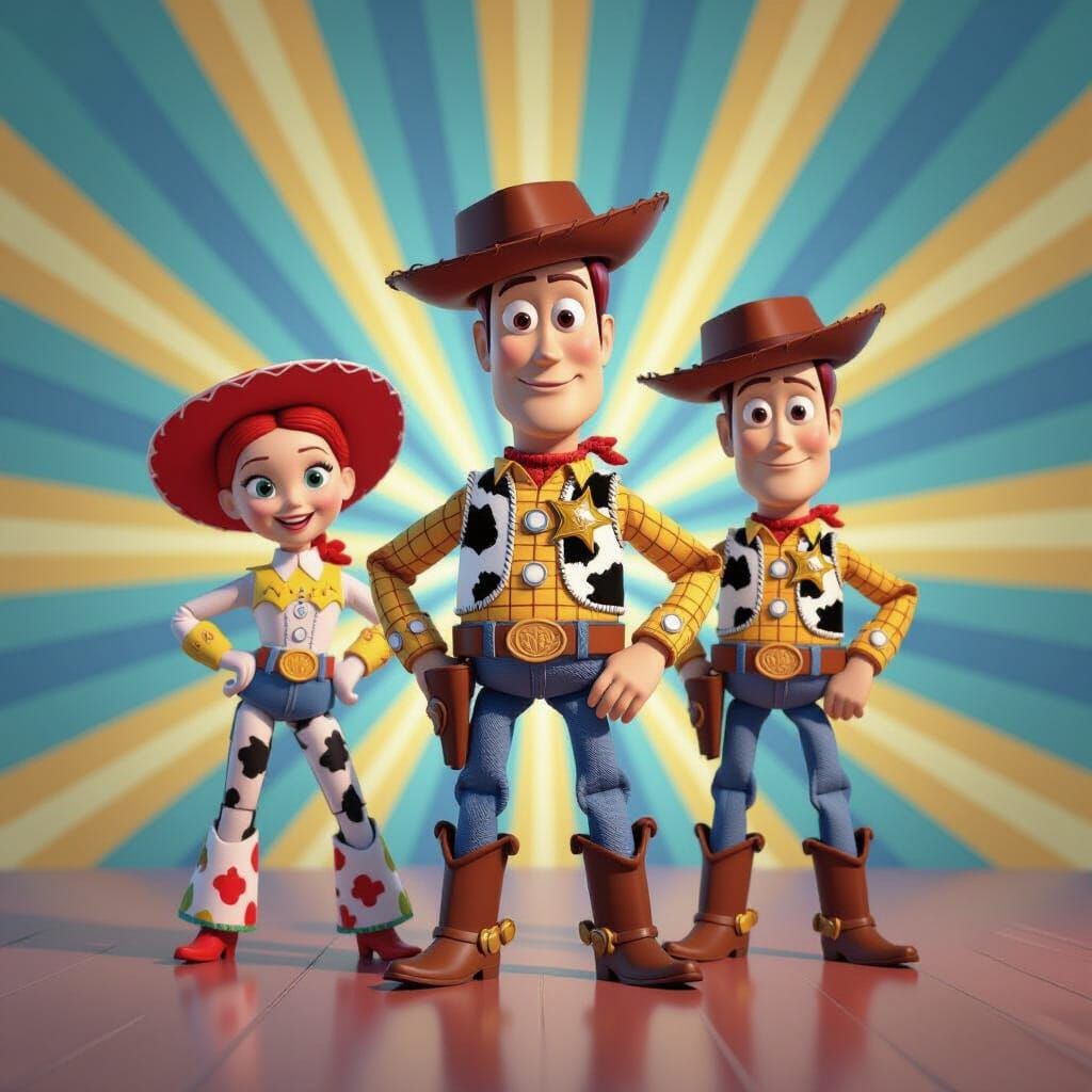 This image showcases Woody, Buzz Lightyear, and friends in a vibrant 3D digital art style. Rendered with cinematic lighting and rich textures, it captures the playful spirit of beloved characters.