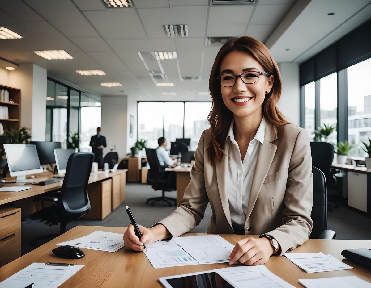 A photograph of a smiling businesswoman working at her office desk. The image evokes themes of female leadership and professional success in a modern workplace.