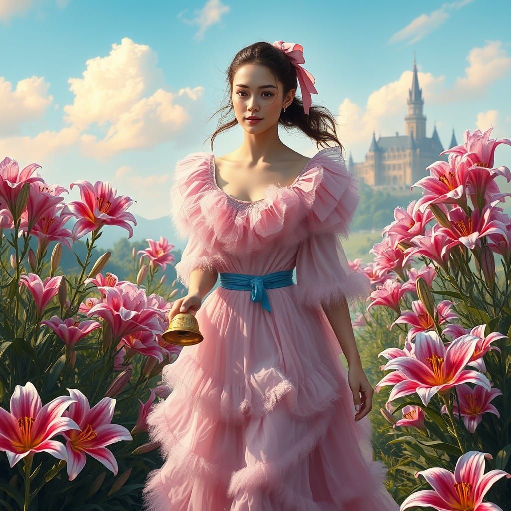 A beautiful woman wearing pink and white fuffy dress with a blue belt walking in The incredible Sandhof lilies of Namibia, she is holding a golden bell,brown long hair, pink ribbon in her hair,bg castle in the distance, vibrant colors, detailed,Trompe-d'loeil, indian ink, acrylic airbrush shimmering effect.