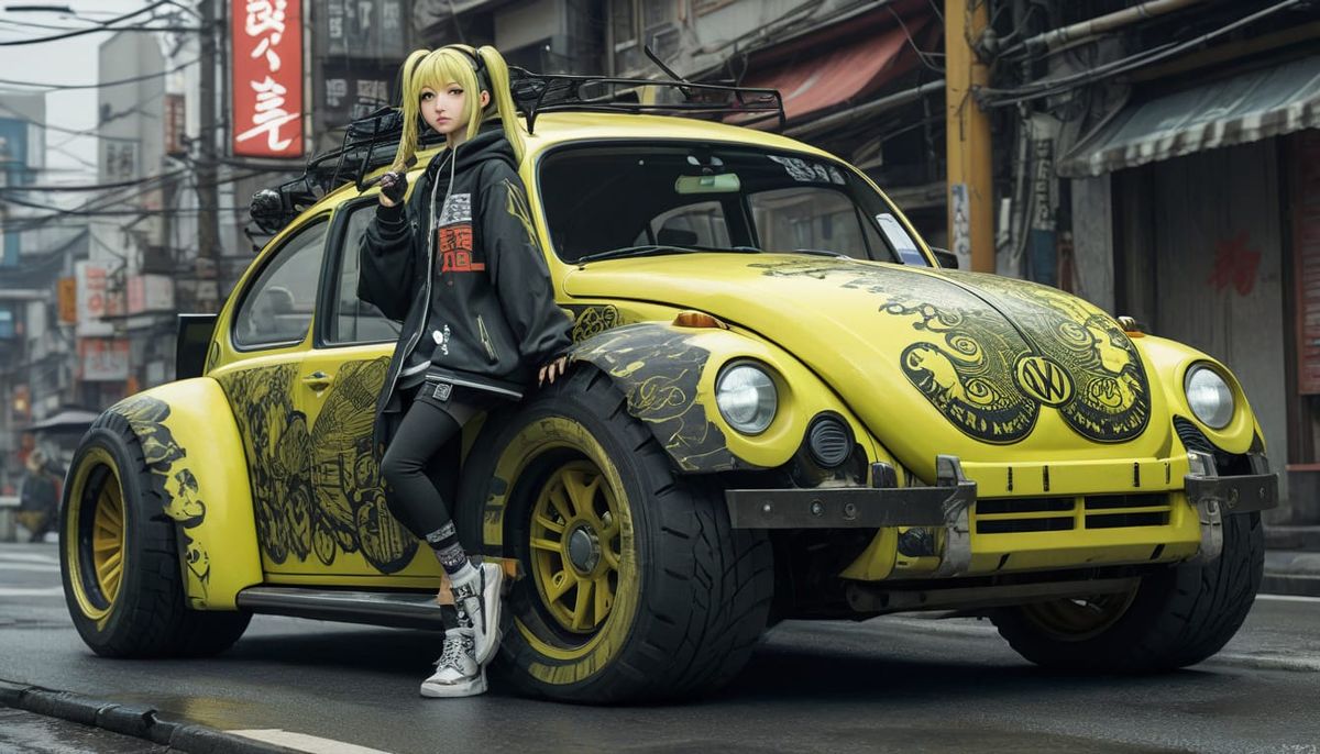 a japanese girl driving neon yellow VW Beetle with big tires, VW beetle in modification using rocket launcher, she wearing Hip-hop outfit, holding UZI, a detailed painting, trending on pixiv, ukiyo-e, highly detailed characters, Japanese girl, druillet colorful, magazine illustrations, wrapped in handgun ...