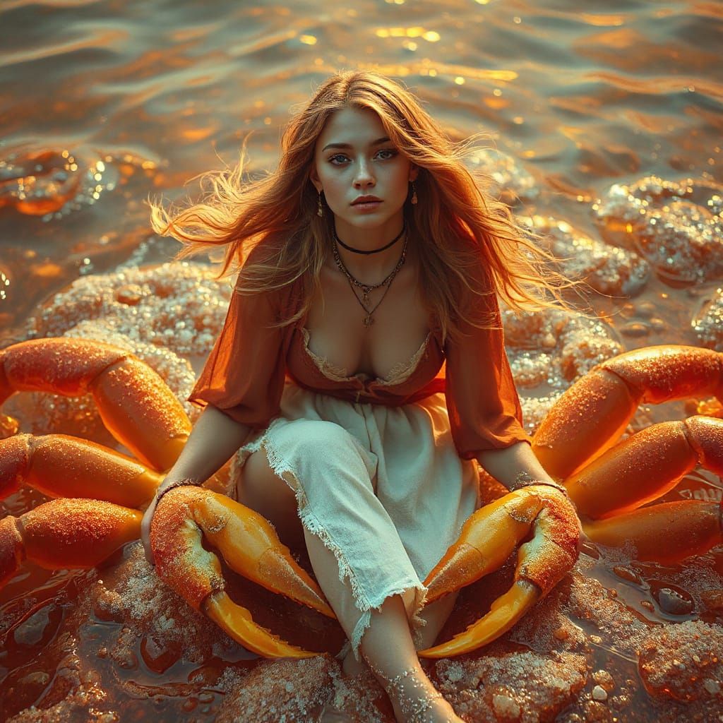 A surreal image of a woman with golden hair on a giant gummy crab amidst a dreamlike soda sea, featuring warm amber and tangerine tones, with soft, ethereal lighting.