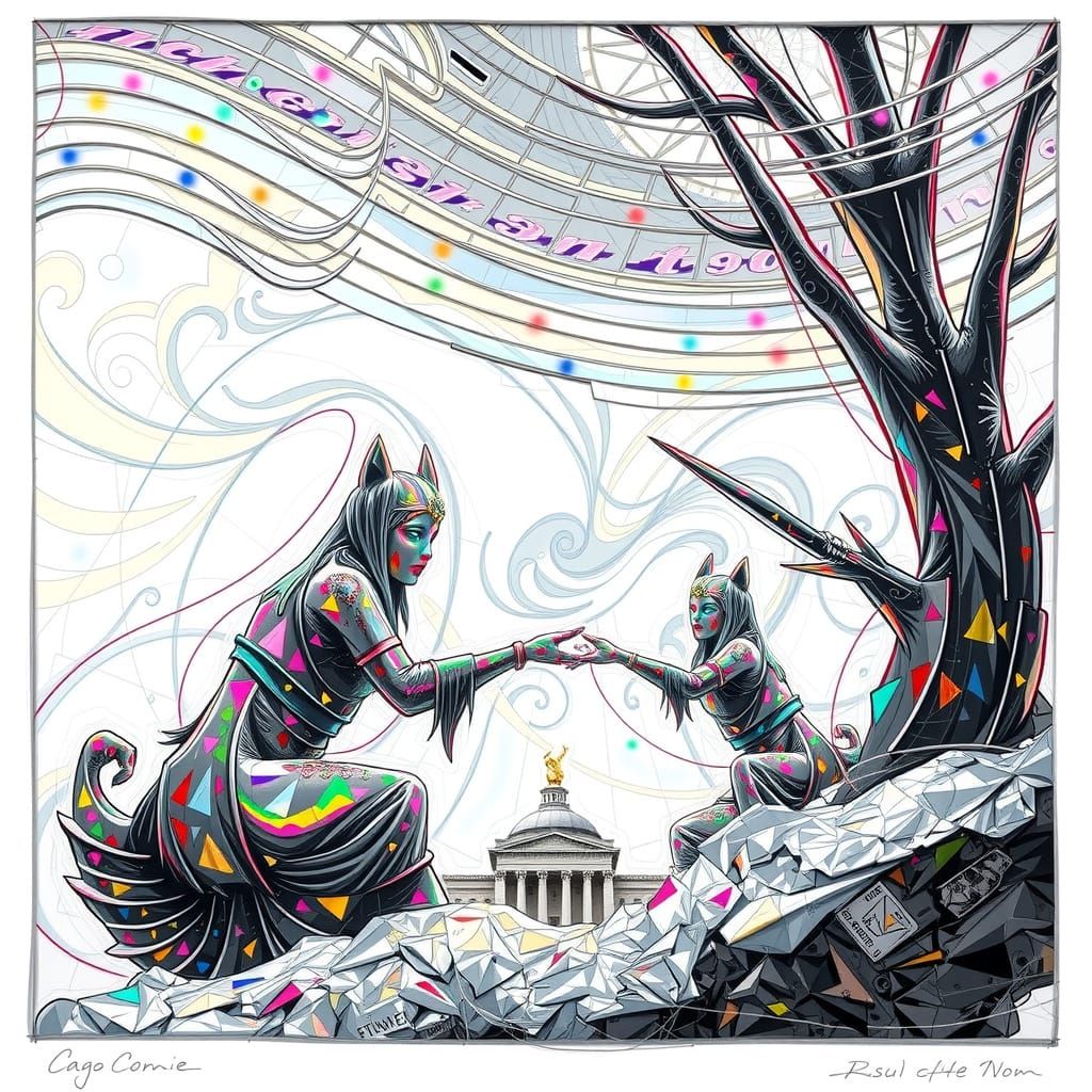 This image showcases a hyperrealistic sculpture bathed in vivid red, green, yellow, black, and white light. Intense, dynamic illumination highlights intricate textures and reflected grandeur.