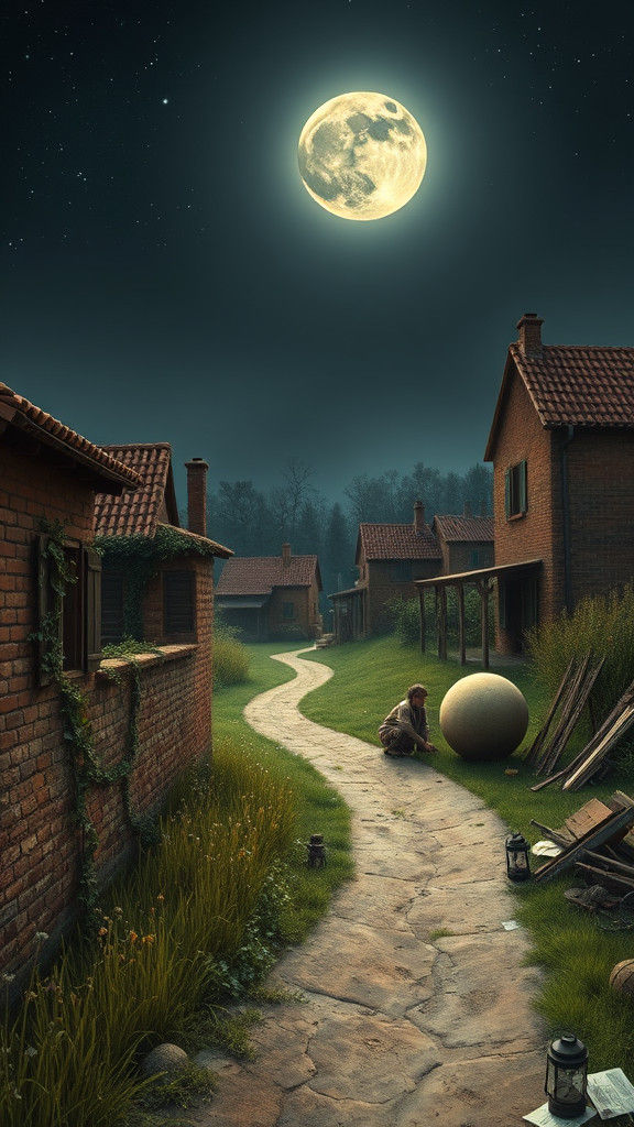 A tranquil village scene under a full moon. The image shows brick houses with terracotta roofs, a dirt path lined with wildflowers, and a figure kneeling near spherical objects in quiet contemplation.