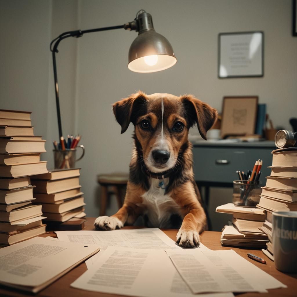 A cozy image of a dog diligently doing homework at a desk late at night. The warm lighting and soft focus create a cinematic, golden hour glow in high resolution.