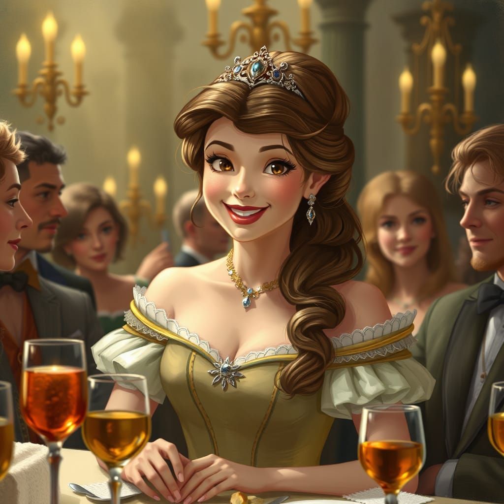 This image shows a portrait of Princess Belle at a feast, smiling happily. The image captures a joyful and celebratory moment.