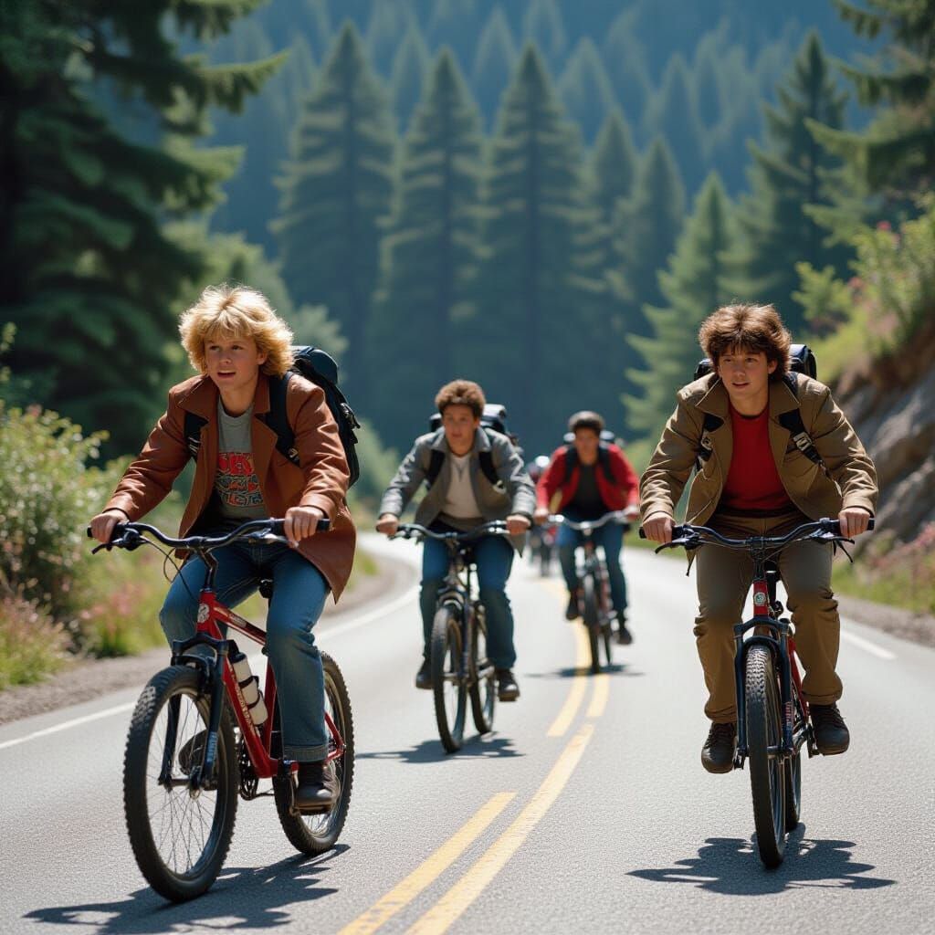 This image shows a scene reminiscent of the biking adventure from The Goonies. The AI-generated image captures a sense of youthful excitement and nostalgic adventure.