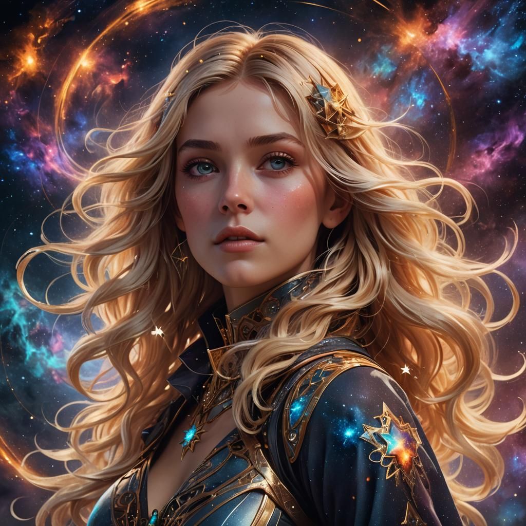 A stunning portrait of a blonde woman surrounded by smoke, stars, and a galaxy backdrop. The image features vibrant colors and dynamic lighting, reminiscent of Art Nouveau. Rendered with hyperdetailed digital painting techniques.