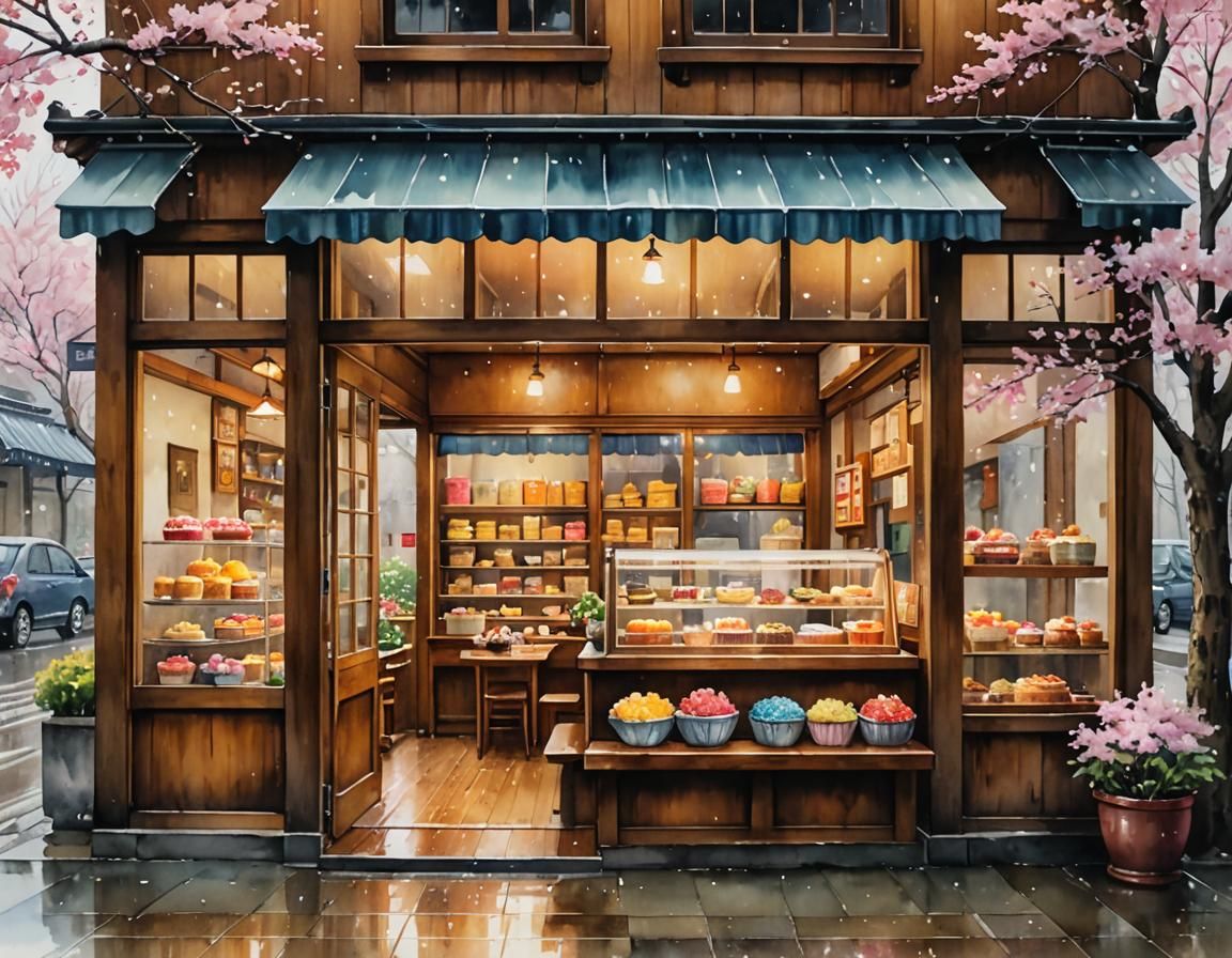 This image shows the interior of a cake shop on a rainy day, rendered as a watercolor painting. A shelf displays cakes while outside is a park with cherry blossoms.