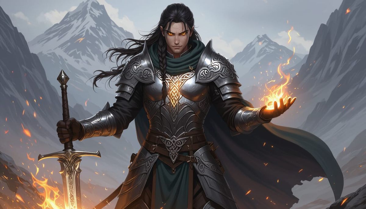 This image shows a tall, imposing anime-style knight radiating supernatural heat. Clad in silver armor with Celtic runes, the androgynous figure stands in a heroic battle stance against a misty mountain backdrop, as 8k resolution digital art.