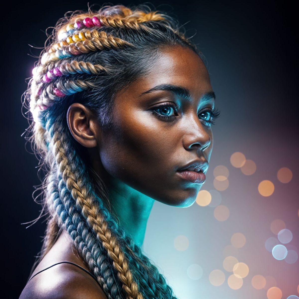 This image shows a beautiful woman with a mesmerizing hairstyle that shimmers and changes color, creating a dreamlike effect in a digital art piece