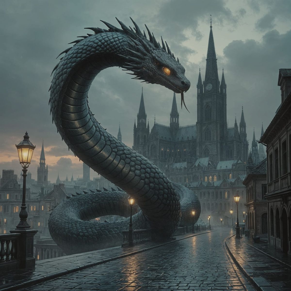 This image depicts a massive, ancient serpent encircling a gothic city at dusk. Rain-slicked streets reflect gaslight, with iridescent scales under dramatic lighting, blending photorealism and surrealism.