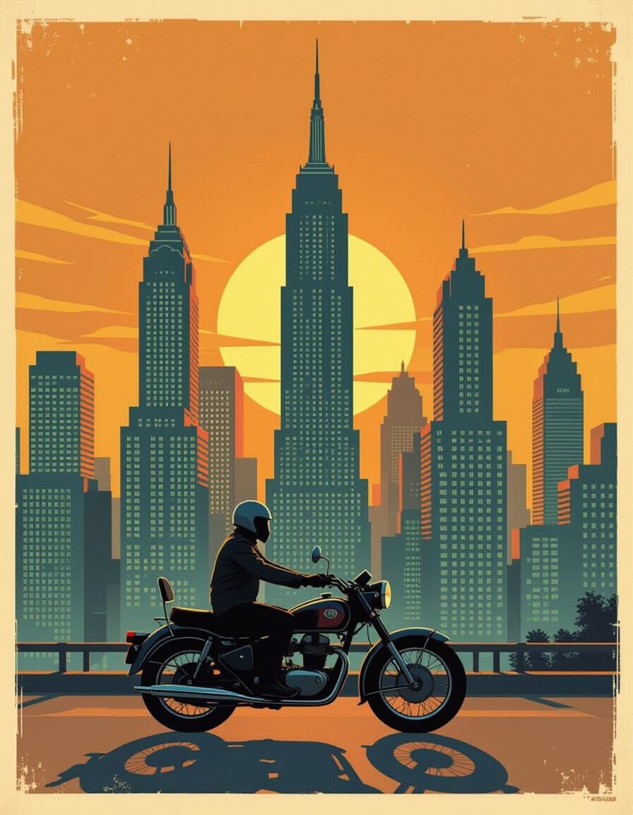 This digital illustration depicts a lone figure on a vintage motorcycle against a backdrop of towering Art Deco skyscrapers at sunset. It features a nostalgic, muted color palette and cinematic lighting, evoking quiet reflection.