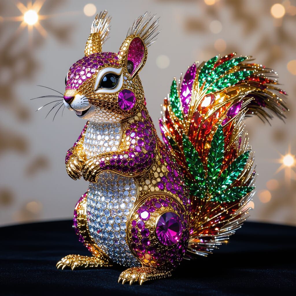 A hyperrealistic sculpture of a squirrel covered in crystals and cannabis leaf patterns. The squirrel stands playfully against a black velvet backdrop, sparkling with pink, green, gold, and violet gemstones.