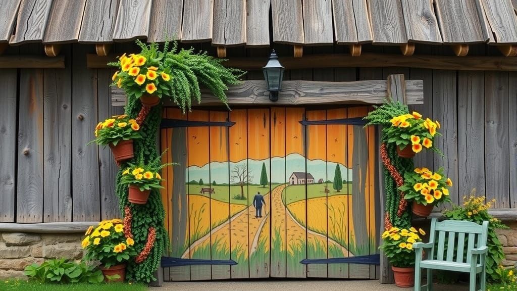 A charming rural barn adorned with folk art. The wooden door features a vibrant, colorful drawing of a countryside scene, reminiscent of naive art styles.