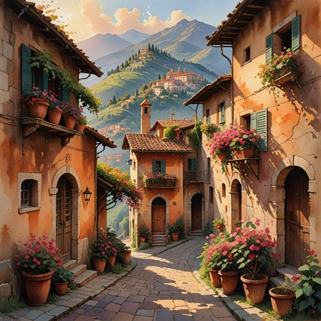 Generate your own charming Italian village paintings. Free, easy, and inspired by mountain views and terracotta hues.