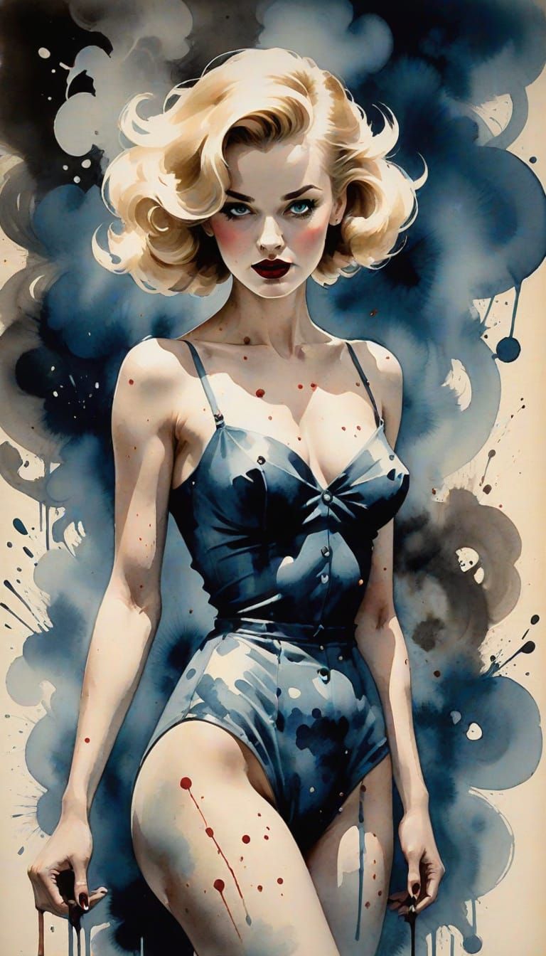 This image showcases a 1950s pin-up woman with direct eye contact, rendered in a fusion of watercolor and surrealist styles. The artwork features fluid textures, smoky gradients, and chiaroscuro lighting.