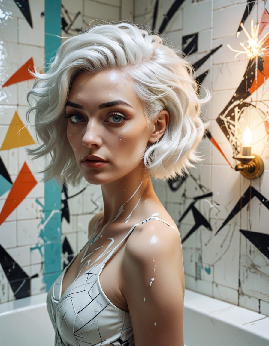A surreal image of a woman with geometric white hair in a vintage bathroom. The image is in a graffiti art style, with marble-like hair texture and soft, luminous lighting. The piece features a pastel color scheme.