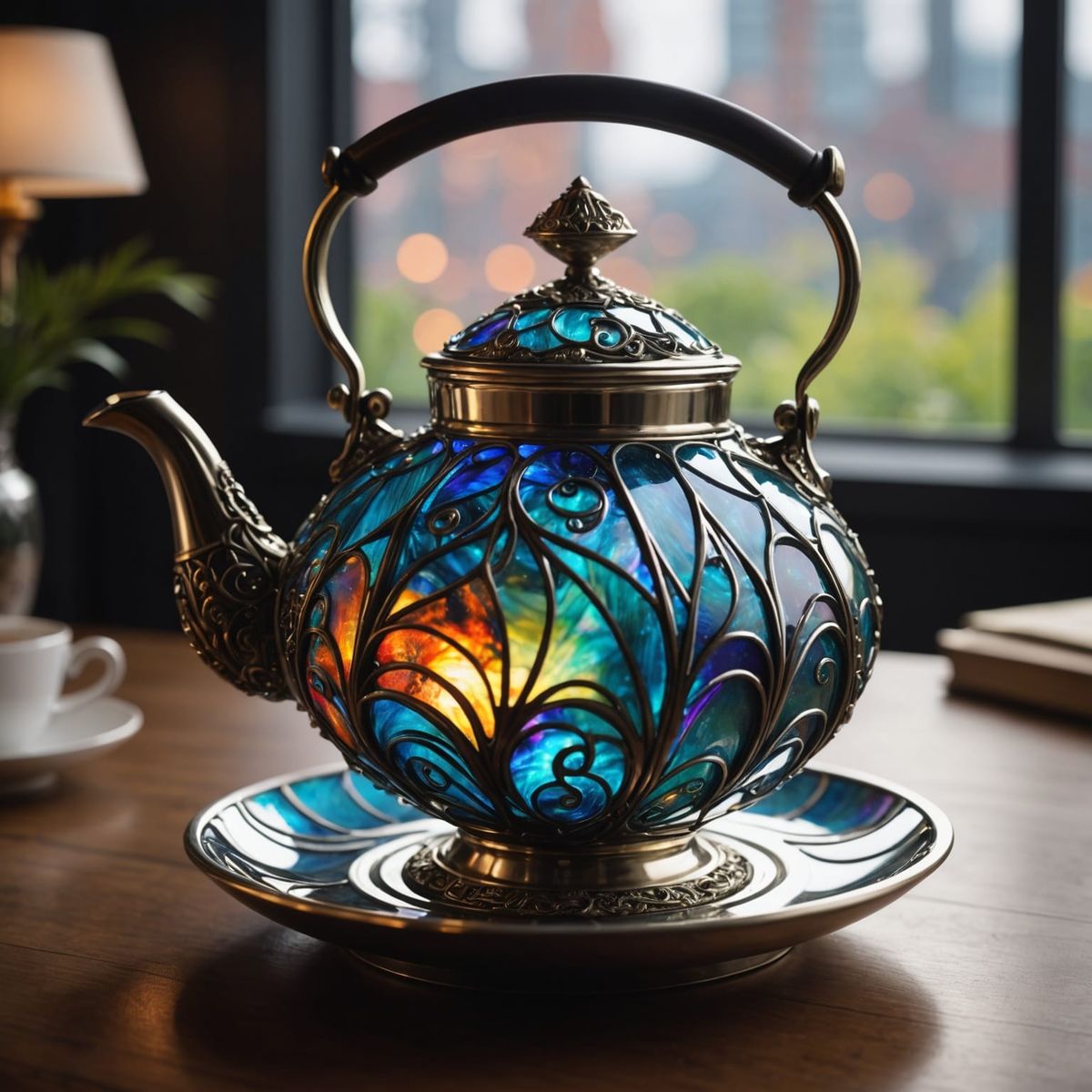 A vibrant image of a stained glass tea kettle pouring cosmic liquid into a teacup. The scene is illuminated with glowing jewelry and iridescent light, creating an otherworldly, radiant effect.