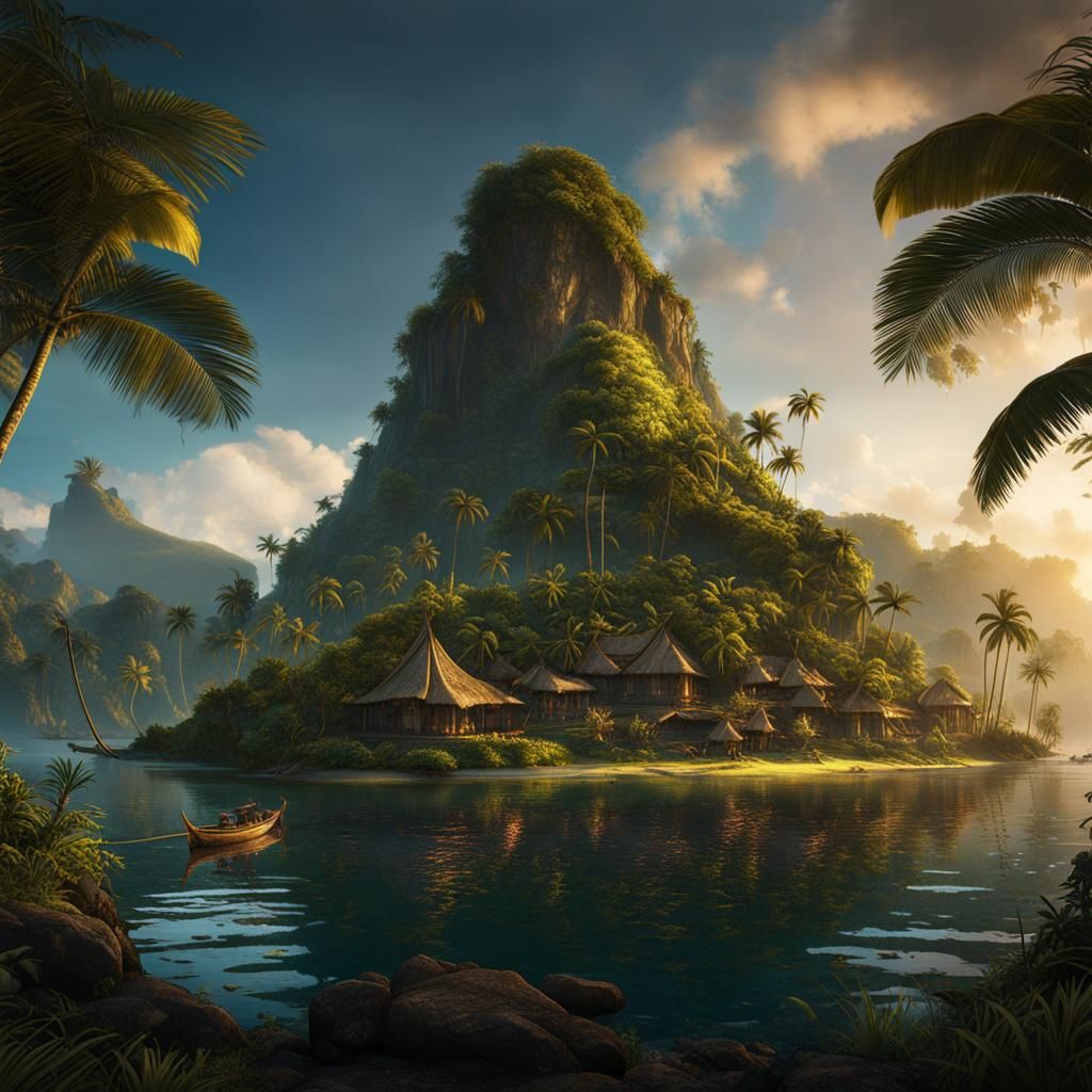This image shows a detailed matte painting of Papua New Guinea. The fantasy concept art features deep color and intricate details in complementary colors, rendered in 8k resolution.