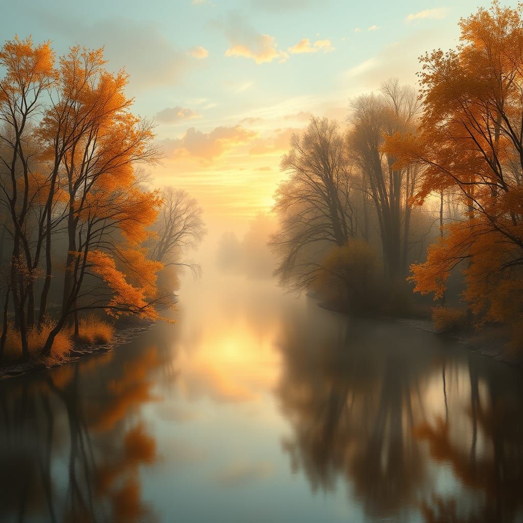 This image shows a tranquil autumn river scene at sunset, enhanced by a misty atmosphere and ethereal light. The hyperdetailed trees and warm golden tones evoke a sense of mystical realism.