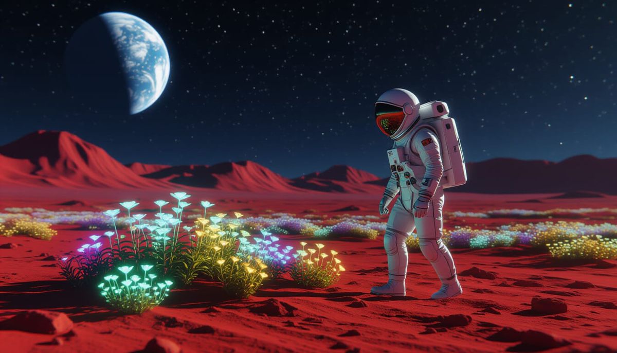 This image shows a lone astronaut in a white suit cultivating a glowing garden on a barren alien world. Earth is visible in the star-filled sky. Photorealistic with surreal elements.