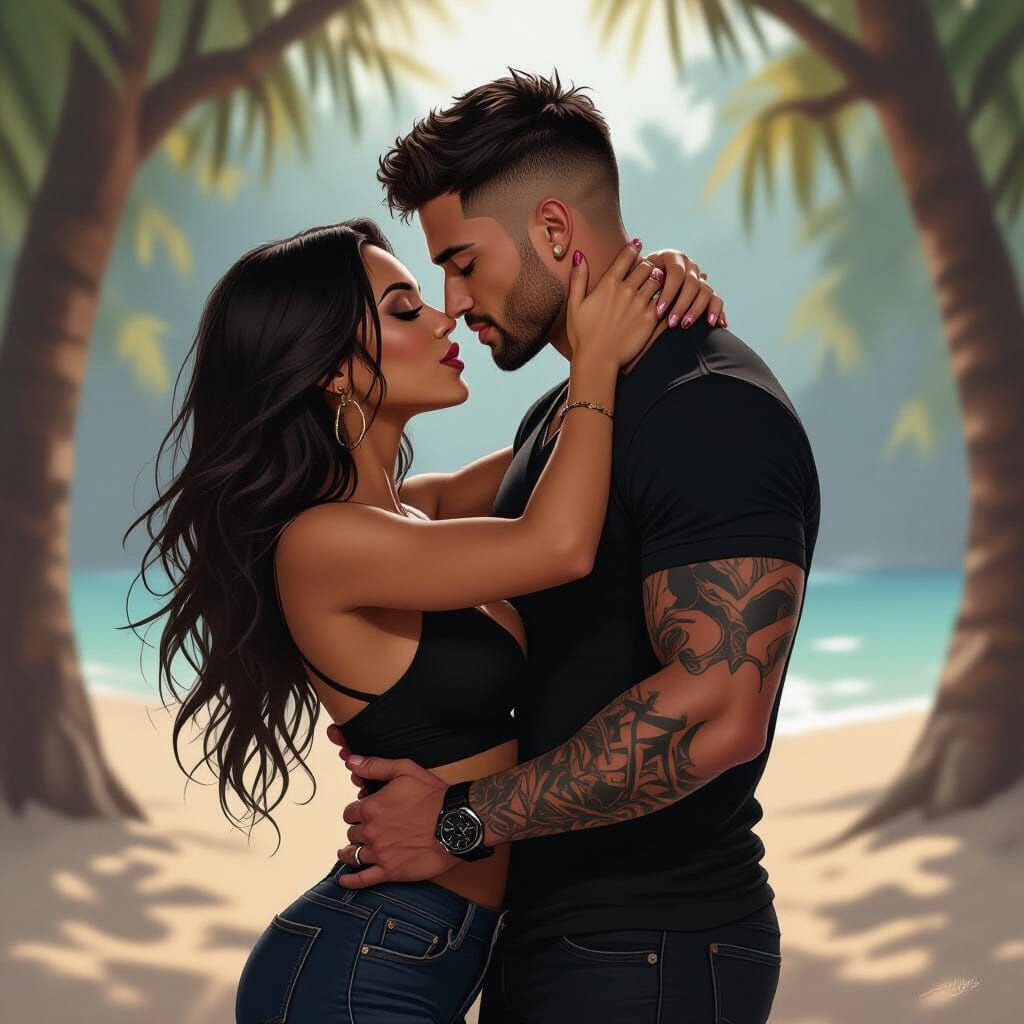 This image depicts a dark romantic scene of a Black woman and a muscular white man in a passionate kiss on a sandy beach. The lighting creates deep shadows, evoking a neo-noir illustration style.