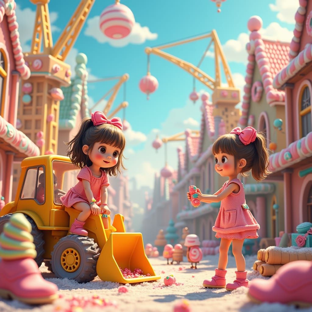 This image shows children playing on a whimsical construction site. The colorful scene features candy-shaped machinery and gingerbread buildings, rendered with hyperrealistic detail and dynamic lighting in a cel-shaded style.