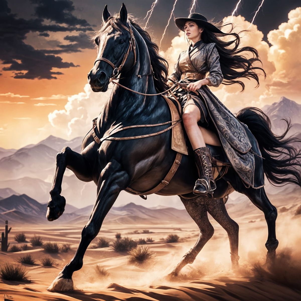 This image shows a cowgirl on horseback in a desert, firing a rifle as a thunderstorm approaches. Features a vintage, cinematic aesthetic with a twilight atmosphere.