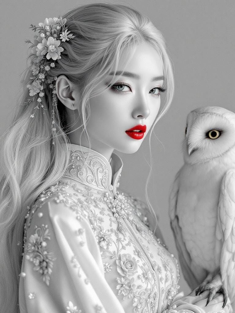 This image shows a monochrome portrait of a noble woman with long white hair and a white owl perched on her shoulder. Her lips are vividly red, set against a soft gray background in a fantasy realism style.