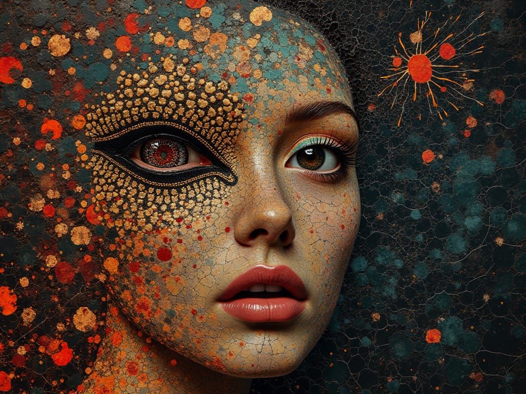 Götterdämmerung 3D broken jagged masterpiece wonderland semiconductor wafer couture special eyes patterned reflections symbolic dreams and neuromorphic abstract holograms and AI evil replicant wearing the latest neuromorphing fashion tenebrism lighting masterpiece 3D collage by Fornasetti brilliantly ...