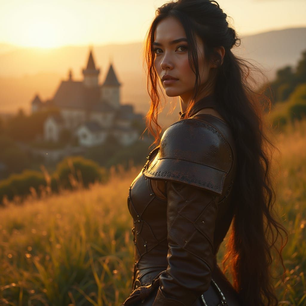This image shows a powerful female warrior standing on a grassy hill, gazing towards a medieval village bathed in warm, golden light. Her long hair flows in the breeze, and she wears intricately crafted leather armor with subtle scars, evoking a sense of adventure and cinematic atmosphere.