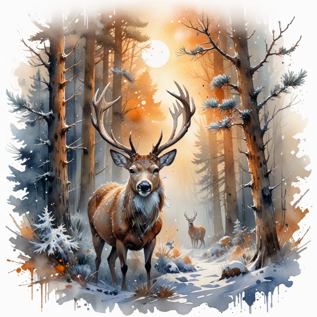 A striking picture of a white-tailed stag in a moonlit pine forest during winter. This watercolour image features broad antlers with ice crystals and amber eyes, in a surreal, ethereal style.