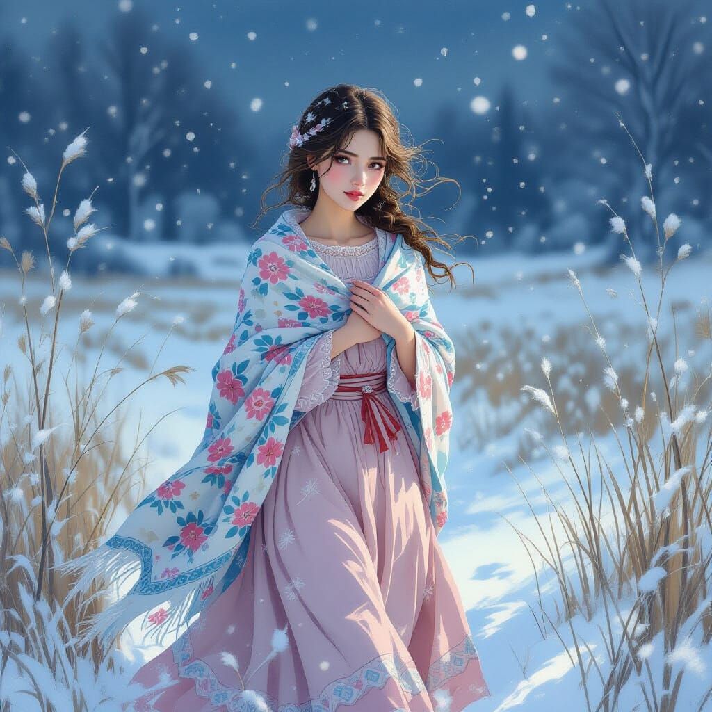 A striking picture of a Ukrainian woman in traditional dress walking through a snowy field at twilight. The image blends watercolor textures with anime and art nouveau elements, creating a dreamlike, mystical atmosphere.