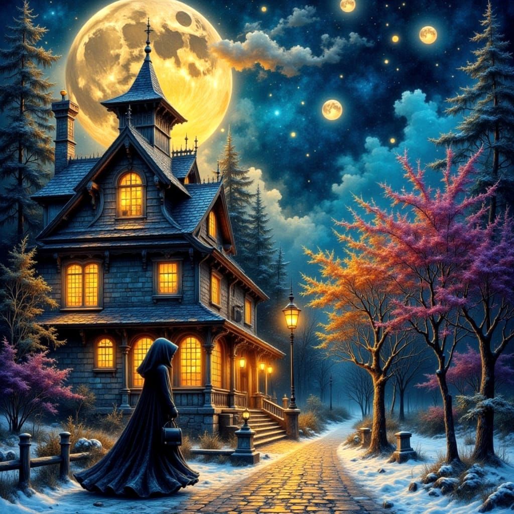 A beautiful, mysterious woman in a hooded cloak waits by an old tavern under a moody sunset and full moon. Features detailed ink lines and a rich, colorful palette.