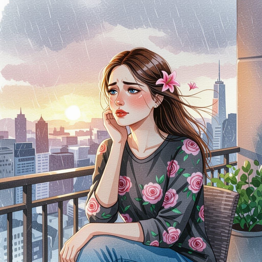 This image depicts a melancholic Ukrainian woman on a skyscraper balcony, gazing at the horizon. The watercolor art style conveys a sense of sadness and uncertainty about the future amidst war and a desire for peace.
